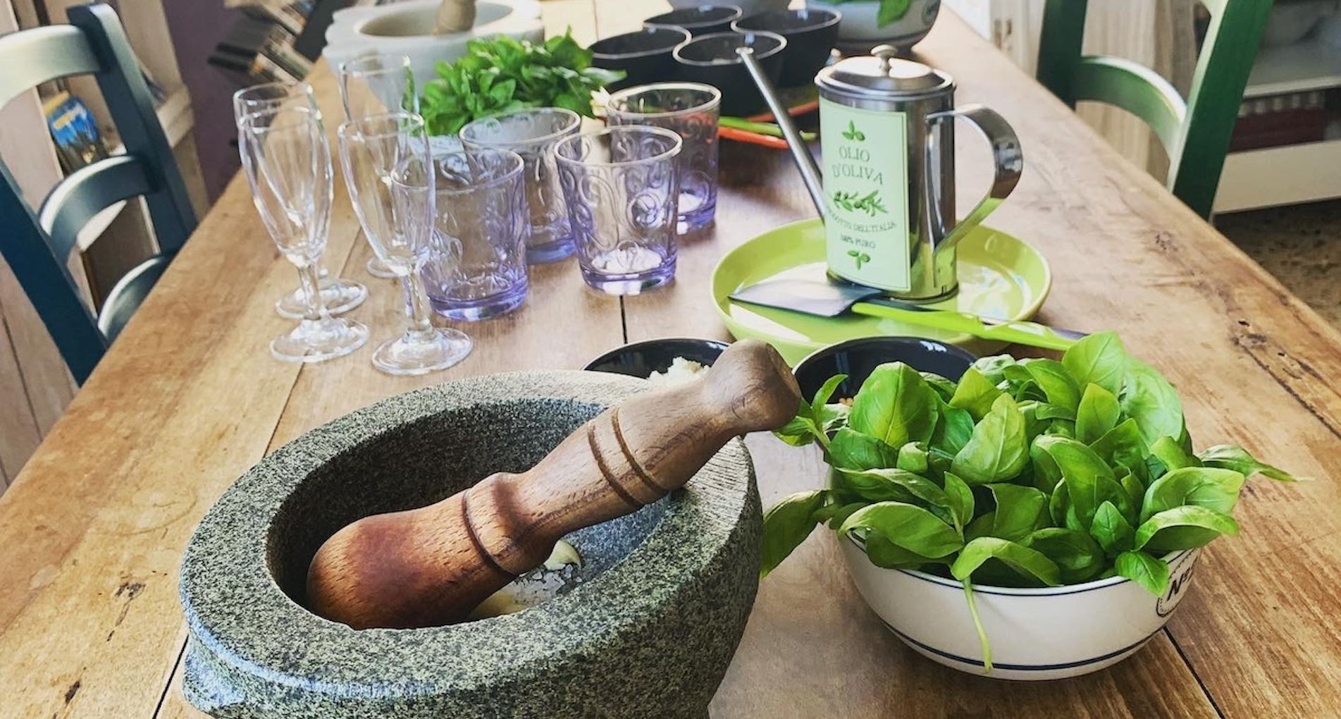 My dog Ettore and I will welcome you with a glass of prosecco, and when the pesto is ready, you can enjoy it with a plate of pasta—its flavor will make you forget all about the stairs you climbed to get to my kitchen. Over pleasant conversation, you’ll discover the history and tradition behind the flavors of Ligurian cuisine.